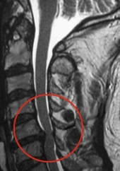 Die Bandscheiben der Wirbelsäule befinden sich zwischen den Wirbelkörpern und funktionieren als bewegliche Stoßdämpfer bei allen Bewegungen des menschlichen Körpers. Sie bestehen aus einem elastischen inneren Gallertkern und dem äußeren Faserring. Im Bereich der Halswirbelsäule kommt es manchmal, mit zunehmendem Alter, durch Abnutzungserscheinungen, zu einer Schädigung des äußeren Faserringes und Teile der Bandscheibe treten in den Rückenmarkskanal vor - man spricht dann von einem Bandscheibenvorfall (Prolaps). Typisch dafür sind starke Nackenschmerzen ausstrahlend in den Arm, Taubheitsgefühle, bis hin zu zeitweise Lähmungserscheinungen im Arm oder in der Hand. Mittels CT oder MRT haben wir die Möglichkeit einen aufgetretenen Prolaps der Halswirbelsäule zu sichern um dann die Therapie der Wahl einzuleiten. Eine Besserung kann mit Physiotherapie, mittels Chirotherapie und der Gabe von Schmerzmittel erzielt werden, aber nicht selten ist eine operative Behandlung erforderlich in der die ausgetretenen Bandscheibenteile mittels minimal- invasiver neurochirurgische Engriffe, entfernt werden und dadurch eingeklemmte Nervenwurzeln entlastet werden. |